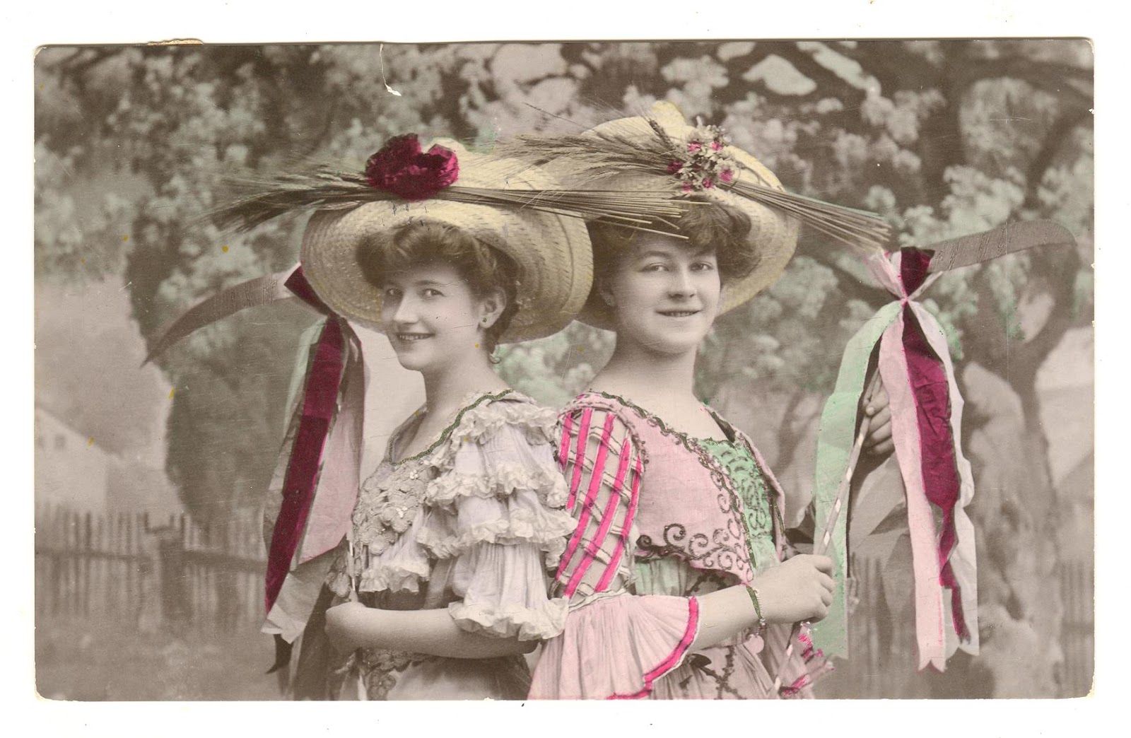 Not sure when this interesting postcard was published. Probably the early 1900s. I sure wonder where and why these 6 young people are posing for the camera. Hats, suspenders, bow ties, regular tie, flower corsages, One couple is holding hands. And what is that lady holding in her right hand. It looks like a metal fan, or maybe a utensil. Well if you bid on this postcard you can wonder what it is all about.